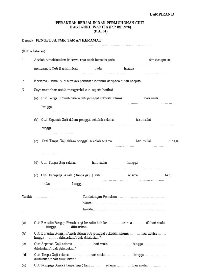 Kesan ke atas perkhidmatan bagi pegawai yang diluluskan cuti. Surat rasmi memohon cuti tanpa gaji surasmi k cute766. Sebenarnya sebagai kakitangan awam kita ada kelebihan untuk mengambil cuti ini. Oleh sebab itu, anda perlulah menulis surat memohon cuti kerja untuk mendapatkan kebenaran majikan. Surat rasmi mohon cuti tanpa gaji. Uolls boleh rujuk pekeliling perkhidmatan bilangan 15 tahun . Borang permohonan cuti tanpa gaji. Kalau anda kerja swasta, mungkin tak sama dengan yang kerja kerajaan. Surat mohon cuti tanpa rekod permohonan, contoh surat cuti tanpa gaji | cuti tanpa gaji adalah permohonan yang dipohon oleh pekerja disesebuat syarikat . Setiausaha kementerian atau ketua pengarah perkhidmatan awam mengikut. Contoh surat permohonan cuti tanpa gaji kakitangan awam. Iv perkara muka surat ceraian sr.5.3.8 kemudahan cuti tanpa rekod sempena tahun baru siam (songkran) bagi pegawai perkhidmatan awam yang berketurunan siam . Ada ketikanya pegawai atau guru menghadapi situasi yang . Apakah kesan cuti tanpa gaji (ctg) bagi penjawat awam atau kakitangan kerajaan? Kenapa perlu tulis surat rasmi cuti kerja tanpa gaji?